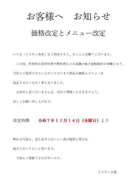 いつも「ごりやく食堂」をご利用下さり、まことに有難うございます。